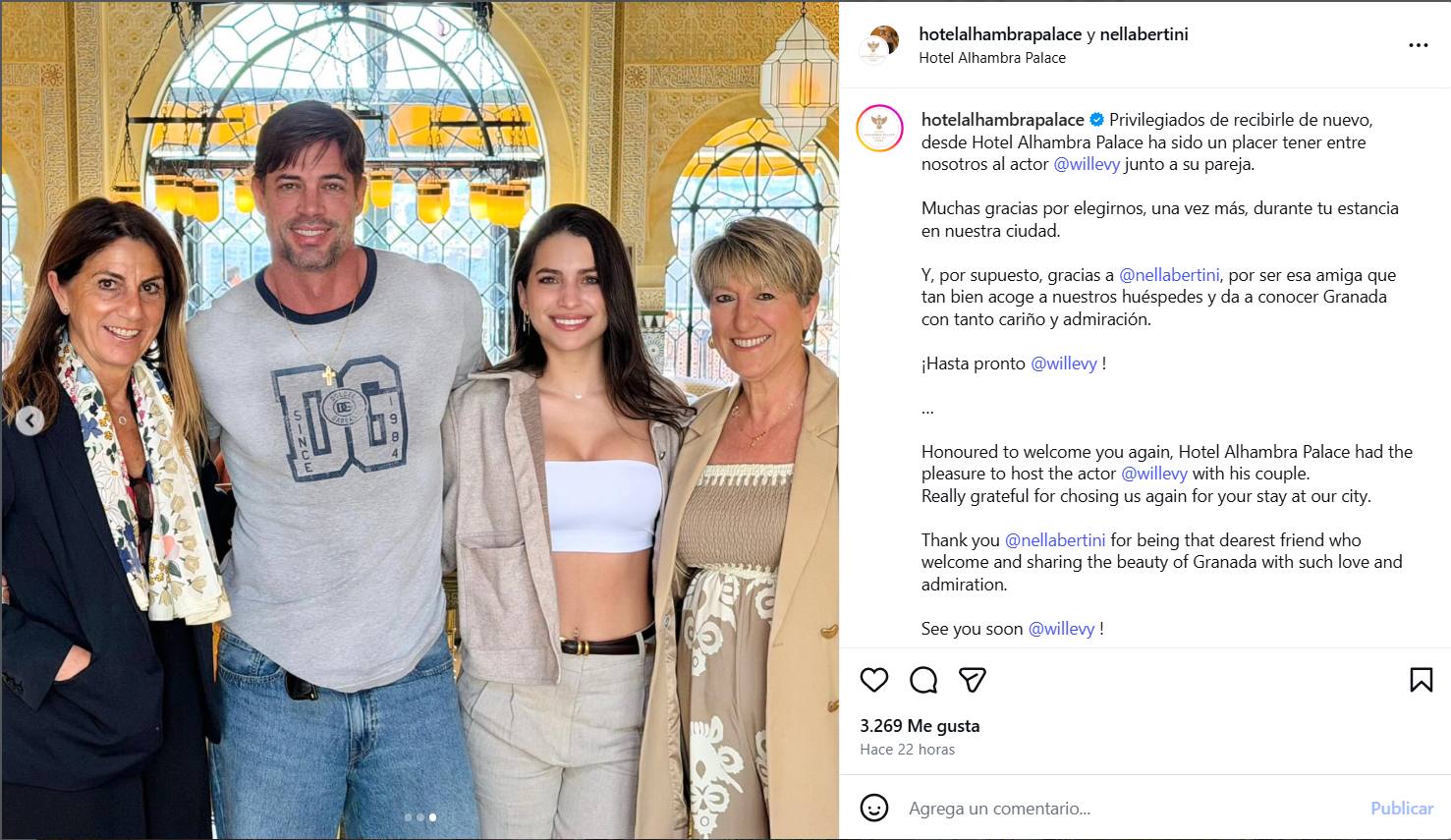 "Privilegiados de recibirle de nuevo, desde Hotel Alhambra Palace ha sido un placer tener entre nosotros al actor @willevy junto a su pareja", destacó el establecimiento en un post, acompañado de fotos ellos posan sonrientes con las anfitrionas del hotel.