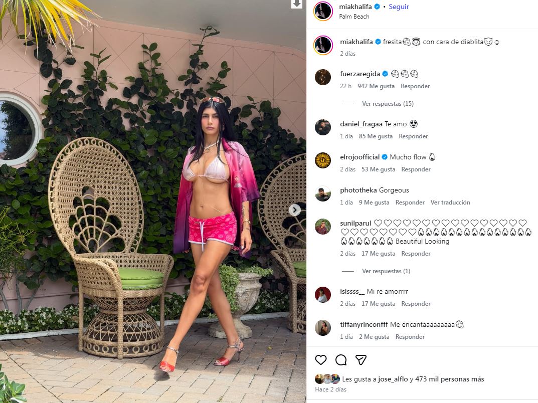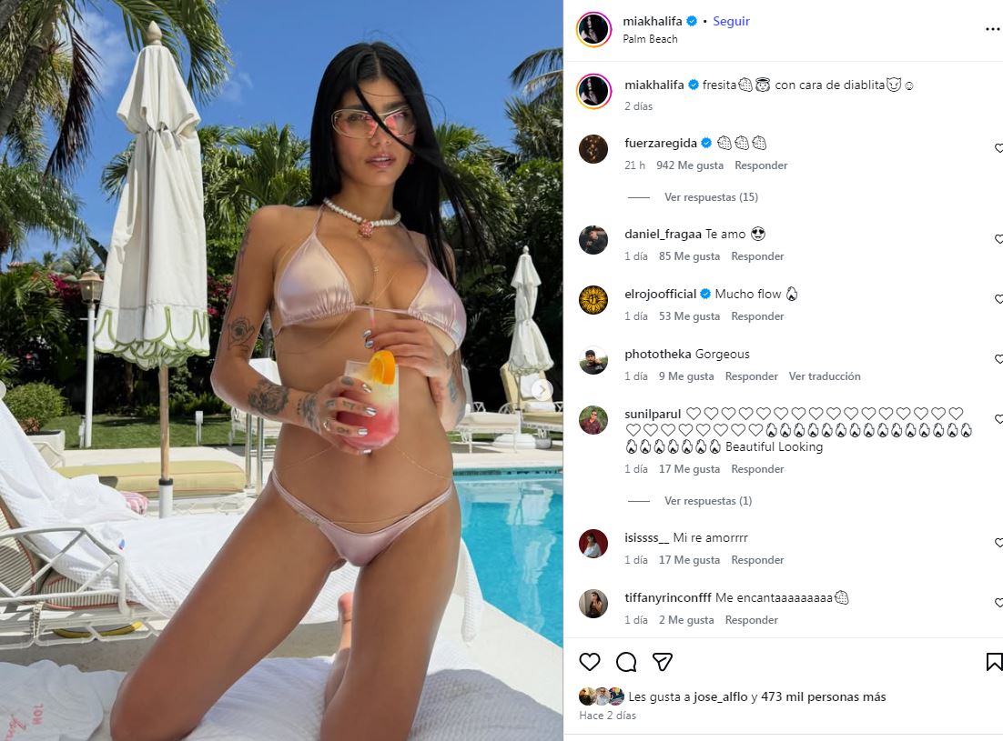 En la imagen, Mia Khalifa posa con un look veraniego, gafas de sol y una bebida en la mano, proyectando una estética relajada y sensual. Sin embargo, el contenido generó debate inmediato.