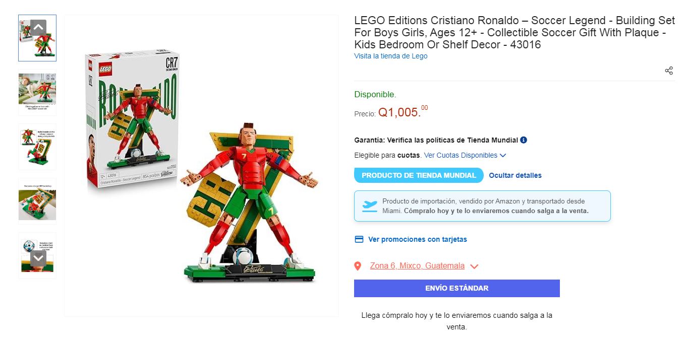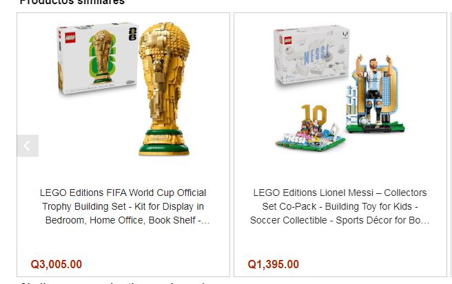 En esta última alternativa el set de Cristiano Ronaldo se encuentra aproximadamente en Q1,005, mientras que el de Messi ronda los Q1,395. Por su parte, el trofeo de la Copa del Mundo puede superar los Q3,000, dependiendo de disponibilidad y costos de importación. Esta opción ofrece pagos en efectivo al momento de recibir y pagos con tarjetas de débito o crédito, incluso visacuotas.