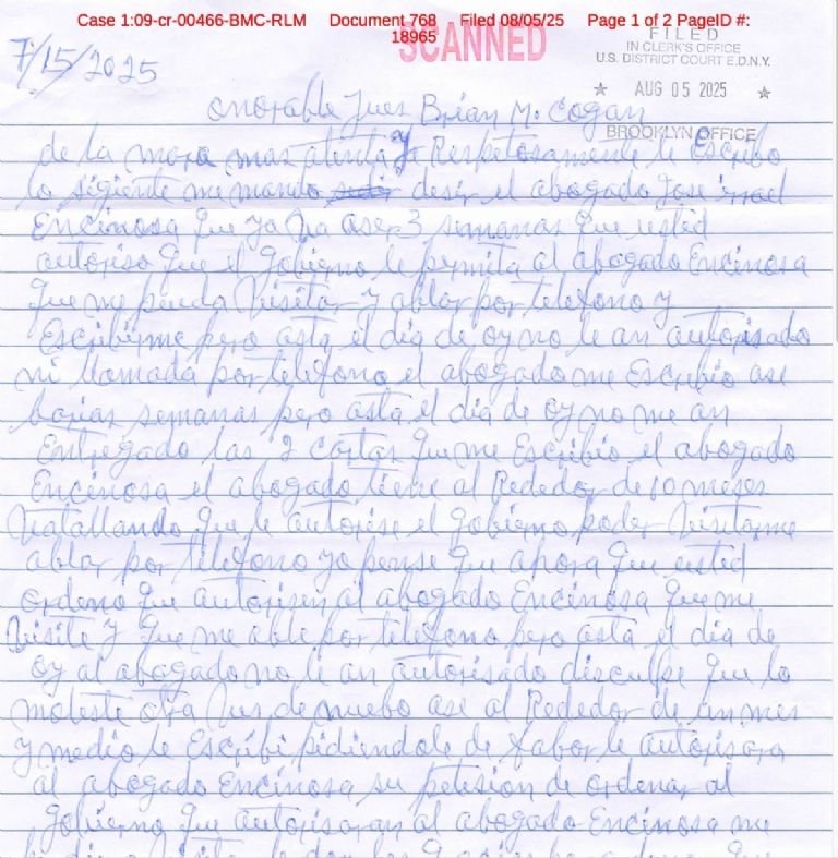 La carta, revelada el 5 de agosto tras ser sellada en Brooklyn, expone que desde hace aproximadamente 10 meses, Guzmán no ha tenido acceso a correspondencia de su defensa legal ni ha podido mantener contacto con su abogado, Israel José Encinosa, pese a que el juez ya habría autorizado la comunicación.