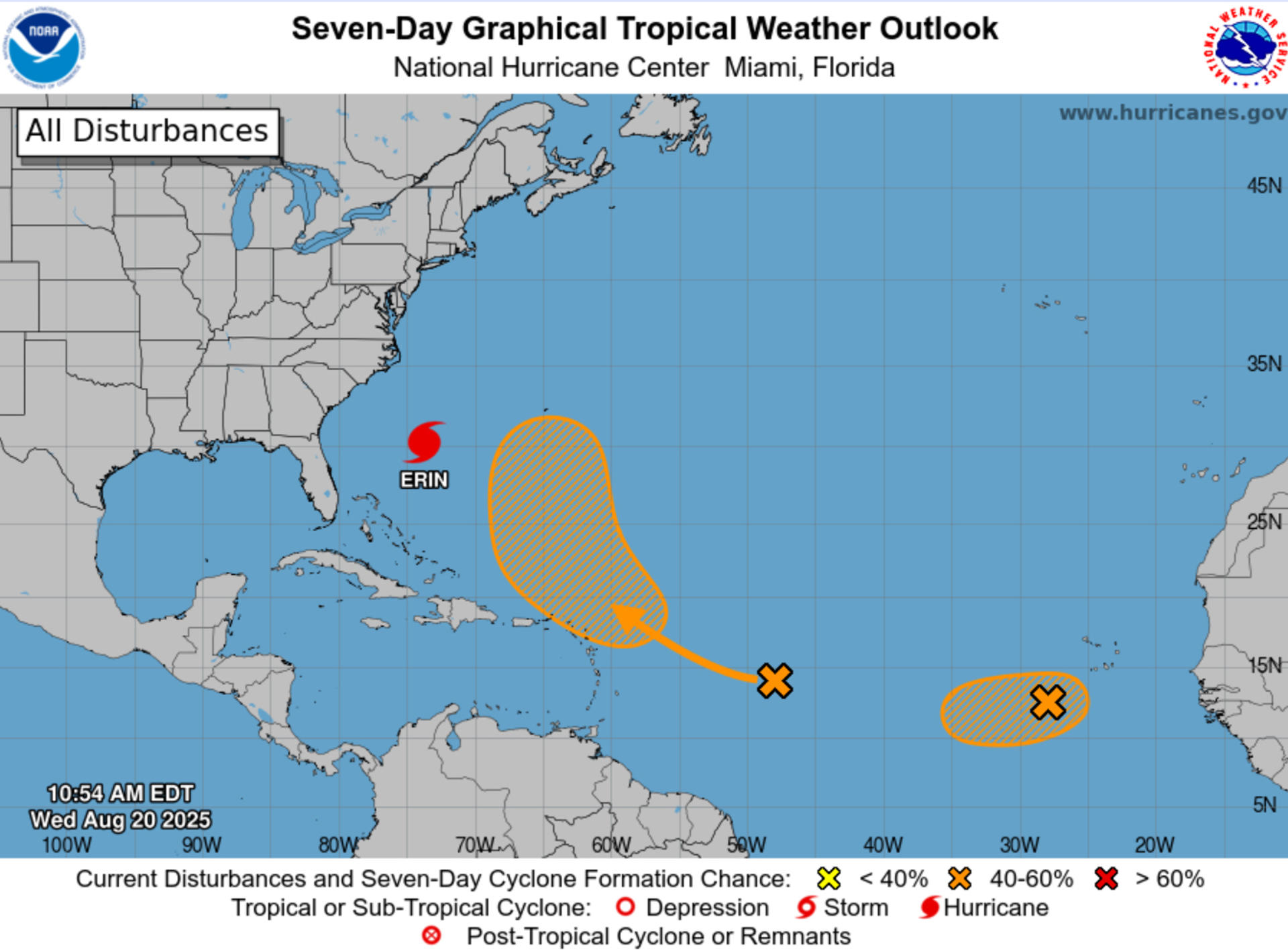 El NHC recordó que se espera que el huracán Erin produzca corrientes de oleaje y marinas que "amenazan la vida a lo largo de las playas de las Bahamas, gran parte de la costa este de los EE. UU., las Bermudas y el Atlántico de Canadá durante los próximos días".