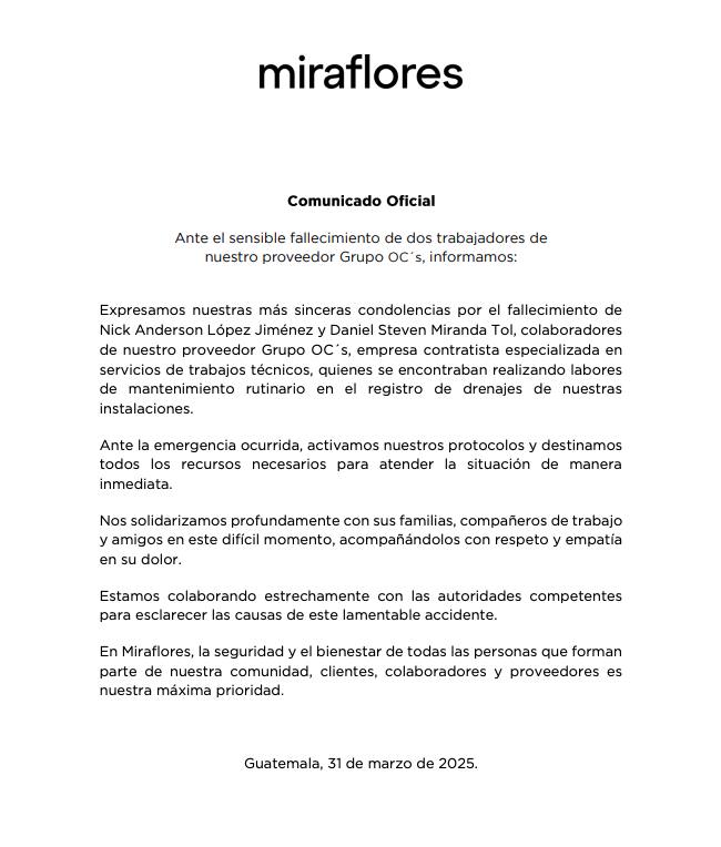 El centro comercial Miraflores se pronunció luego de que se diera a conocer sobre el accidente laboral que provocó la muerte de dos trabajadores que laboraban en esas instalaciones. El hecho ocurrió desde la tarde del pasado domingo; sin embargo, Bomberos Municipales lograron recuperar los cuerpos hasta las primeras horas de este lunes, 31 de marzo.
