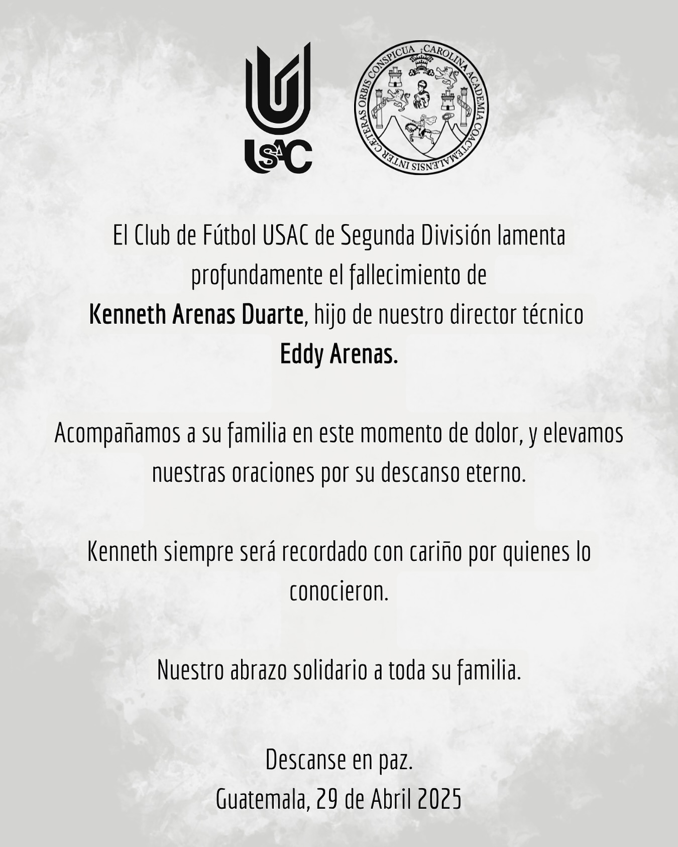 El Club de Futbol Usac lamenta profundamente el fallecimiento de Kenneth Arenas Duarte, hijo de nuestro director técnico. Acompañamos a su familia en este momento de dolor y elevamos nuestras oraciones por su descanso eterno. Kenneth siempre será recordado con cariño por quienes lo conocieron", publicó el equipo en sus redes sociales.