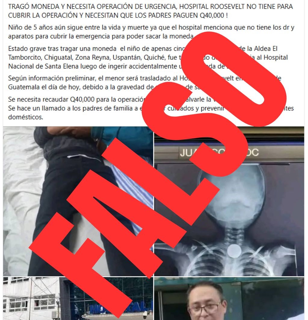 Un variopinto de páginas informativas de Facebook y otras redes sociales como X e Instagram viralizaron una noticia acerca de una supuesta colecta de dinero, de parte del Hospital Roosevelt, para recaudar dinero para la operación de un niño que se había tragado una moneda de 25 centavos. Sin embargo, autoridades de ese centro asistencial salieron al paso de los rumores y desmintieron esas versiones, asegurando que los hospitales nacionales no hacen ese tipo de peticiones.