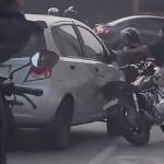Posteriormente, el automovilista le cierra el paso al motorista, quien reacciona propinando una patada al vehículo. El conductor desciende de su automóvil mientras el motorista deja tirada su motocicleta. Ambos se enfrentan a golpes en plena vía, tomándose del cuello y deteniendo por completo la circulación vehicular.