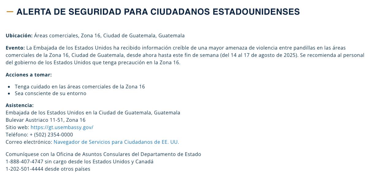 La Embajada de Estados Unidos en Guatemala emitió este jueves 14 de agosto una alerta de seguridad dirigida a sus ciudadanos, tras recibir lo que calificó como "información creíble" sobre una mayor amenaza de violencia entre pandillas en áreas comerciales de la zona 16 de la Ciudad de Guatemala.
