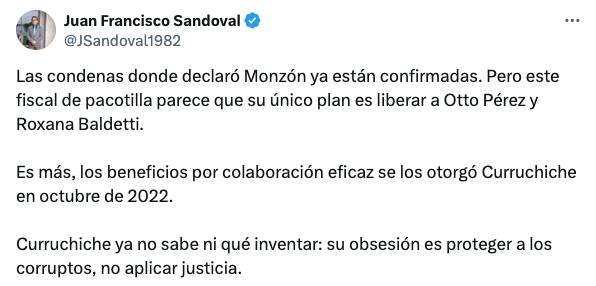 "Pero este fiscal de pacotilla parece que su único plan es liberar a Otto Pérez y Roxana Baldetti. Es más, los beneficios por colaboración eficaz se los otorgó Curruchiche en octubre de 2022", escribió en su cuenta de X.