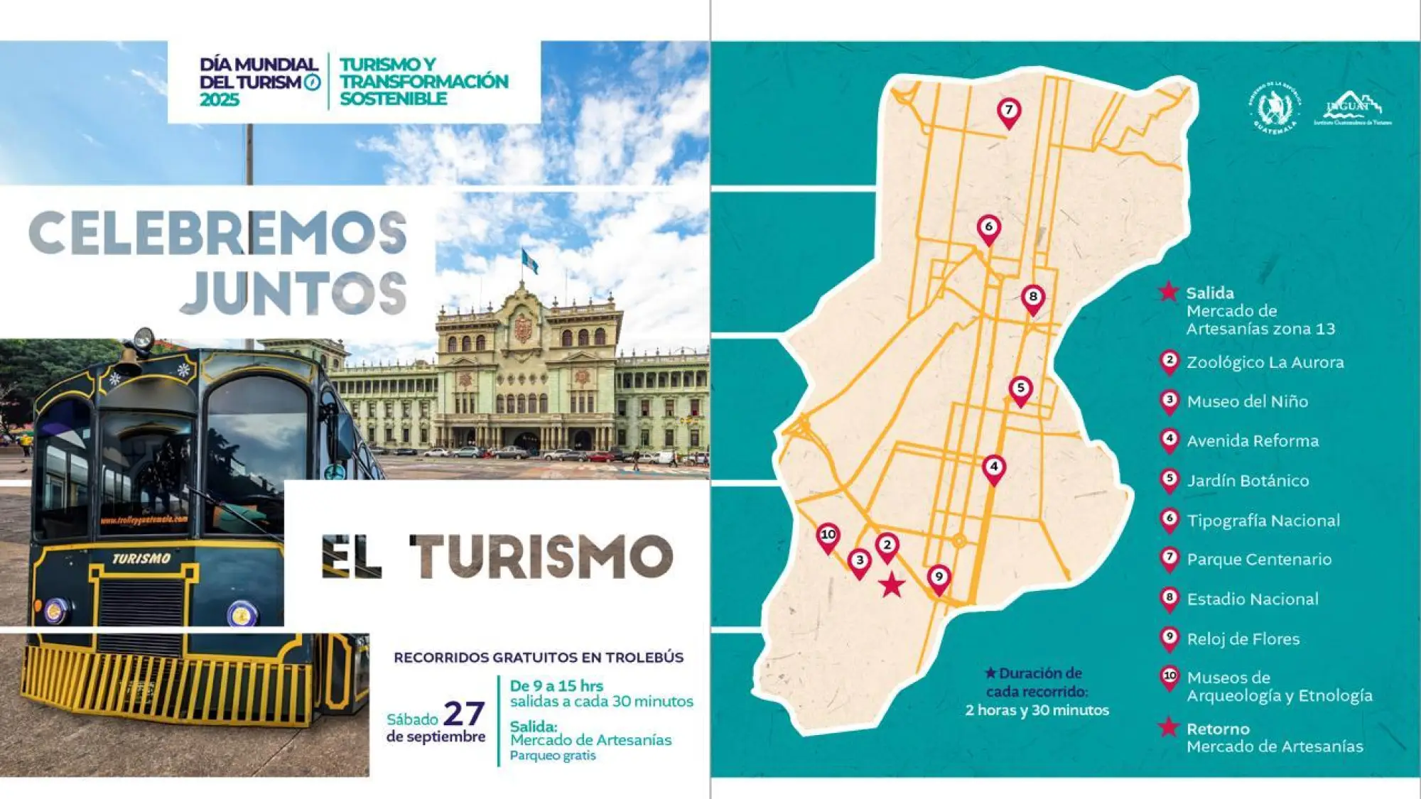 El Instituto Guatemalteco de Turismo (INGUAT) convoca a todos los guatemaltecos a unirse a las celebraciones del Día Mundial del Turismo este sábado 27 de septiembre. Esta festividad incluirá un recorrido gratuito en trolebuses, que permitirá a los participantes explorar diversos atracciones turísticas y culturales de la Ciudad de Guatemala.