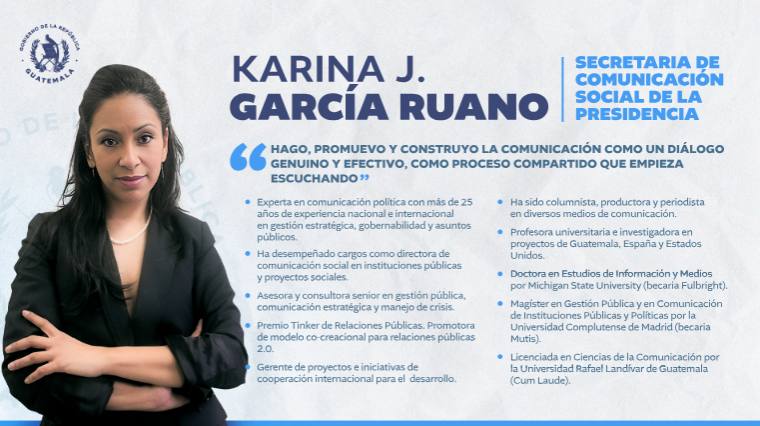 Arévalo anunció que, en sustitución de Palomo, fue nombrada Karina J. García Ruano, a quien describió como una profesional con más de 25 años de experiencia y que ha trabajado en temas de gestión estratégica, gobernabilidad y asuntos públicos. Compartió que ha sido columnista, productora y periodista en diversos medios de comunicación.