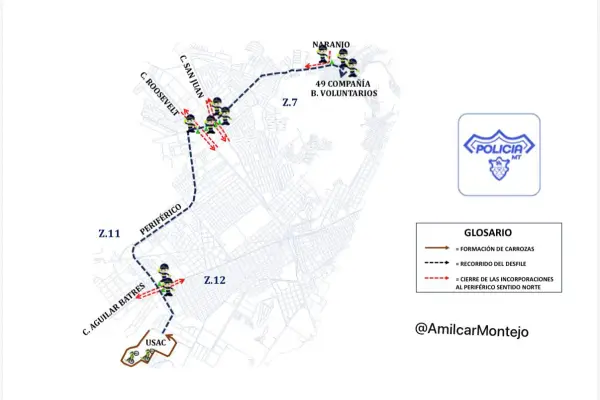 "La única pista que se utilizará para el desfile es la que se dirige desde la zona 12 hacia la zona 1. Mientras tanto, el tramo que incluye los carriles en la vía contraria debe permanecer totalmente libre, así que se prohíbe el estacionamiento en el sector", indicó.