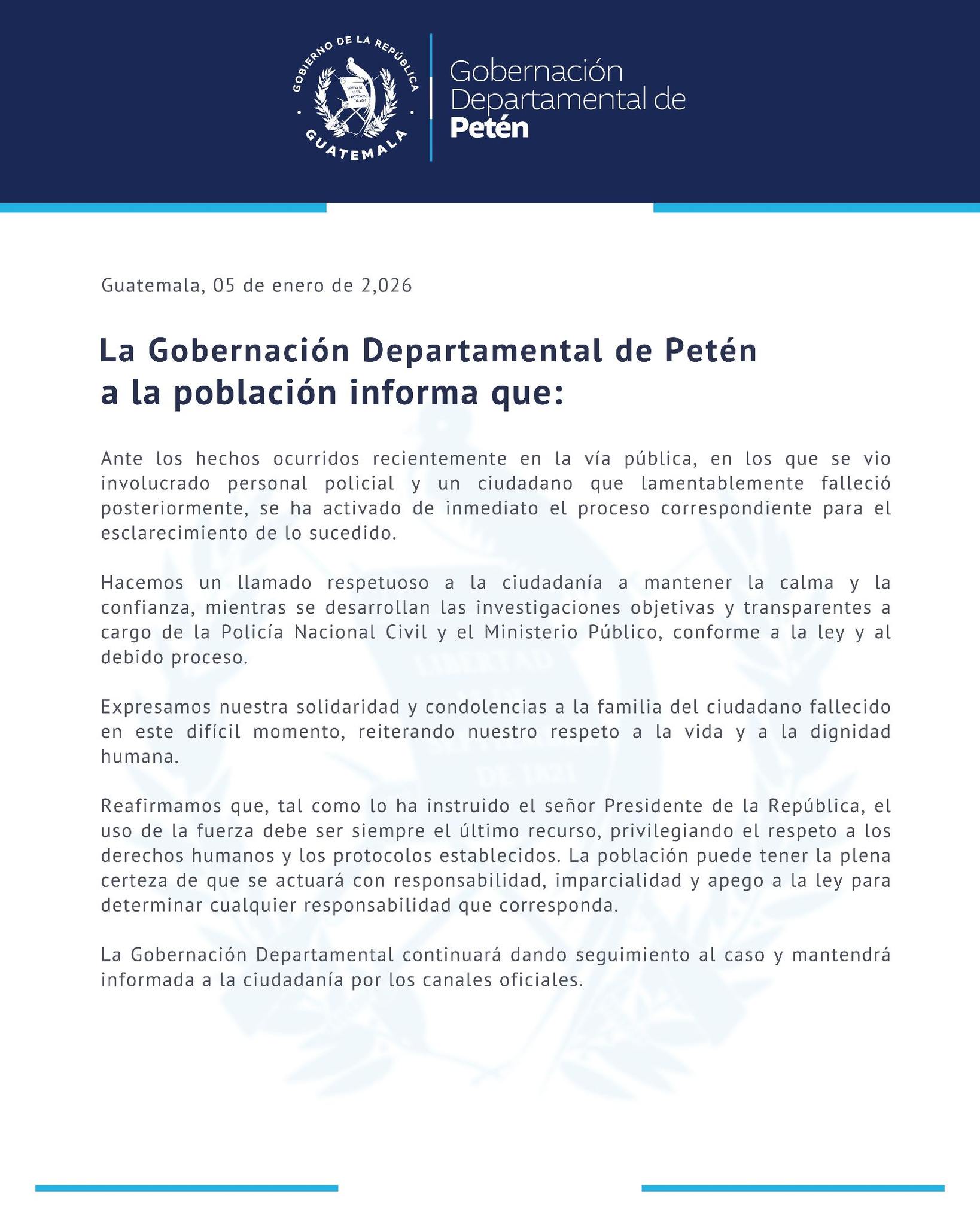 La Gobernación Departamental de Petén informó que se activó el proceso correspondiente para esclarecer lo ocurrido, tomando en cuenta la participación de personal policial y el fallecimiento del ciudadano.