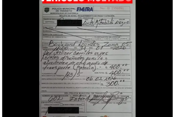 Autoridades de tránsito de la Ciudad de Guatemala salieron al paso, luego de conocer el caso de un carro que invadió el carril exclusivo de motocicletas en la Calzada La Paz durante este sábado (31/01/2026). Según la Policía MT, "la indignación de un vecino se convirtió en acción", al momento en el que mostraban una boleta de multa en un video publicado en canales oficiales.