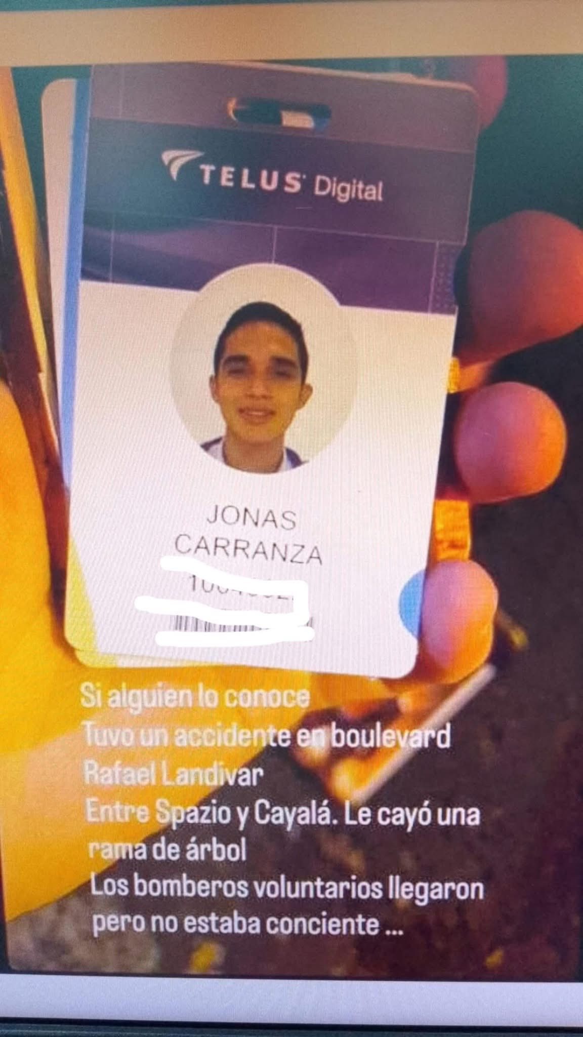 La noche del martes 3 de febrero terminó en tragedia para la familia de Jonas Carranza, un joven de 25 años, trabajador de un call center , quien perdió la vida tras ser impactado por una rama de árbol mientras regresaba a su hogar en la zona 16.