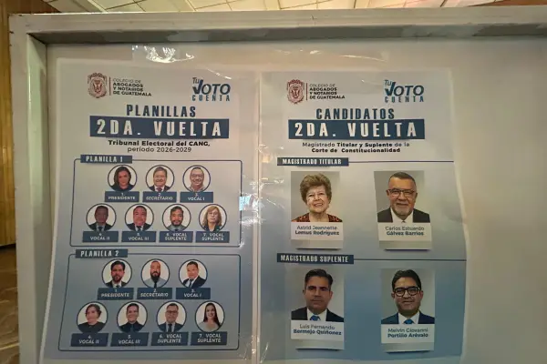 El Colegio de Abogados y Notarios de Guatemala (CANG) lleva a cabo este jueves, 12 de febrero, la jornada de votaciones de segunda vuelta para la elección de magistrados titular y suplente de la Corte de Constitucionalidad (CC). El proceso, de nuevo, se desarrolla con la exclusión de los profesionales de ciencias afines.