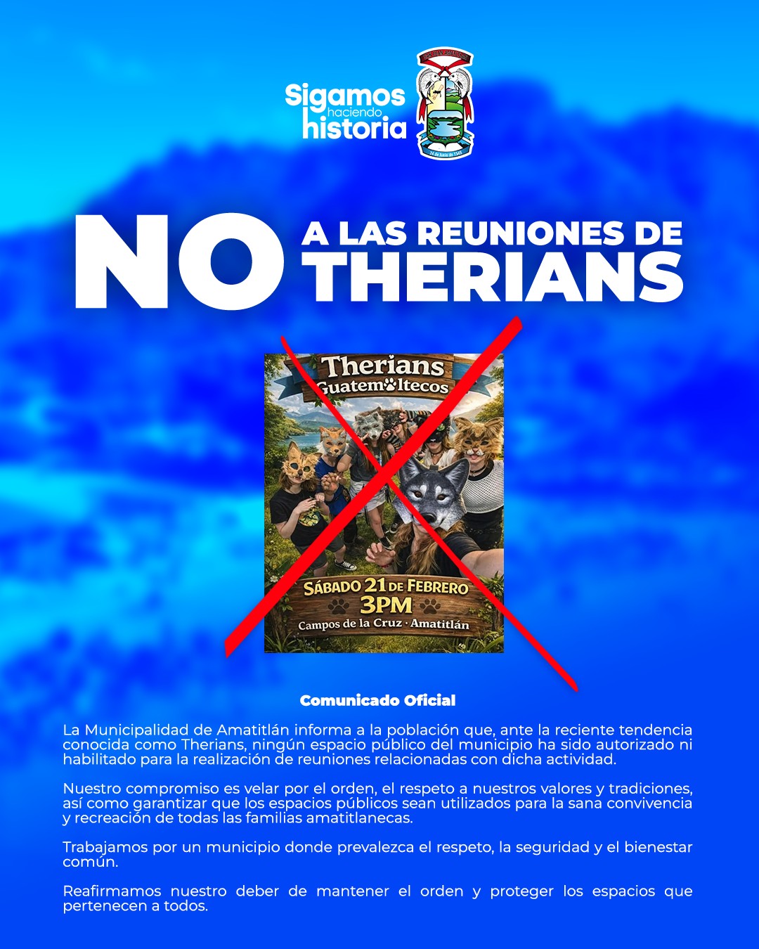 La Municipalidad de Amatitlán emitió un comunicado oficial en el que informó a la población que, ante la reciente tendencia conocida como Therians, ningún espacio público del municipio ha sido autorizado ni habilitado para la realización de reuniones relacionadas con dicha actividad.