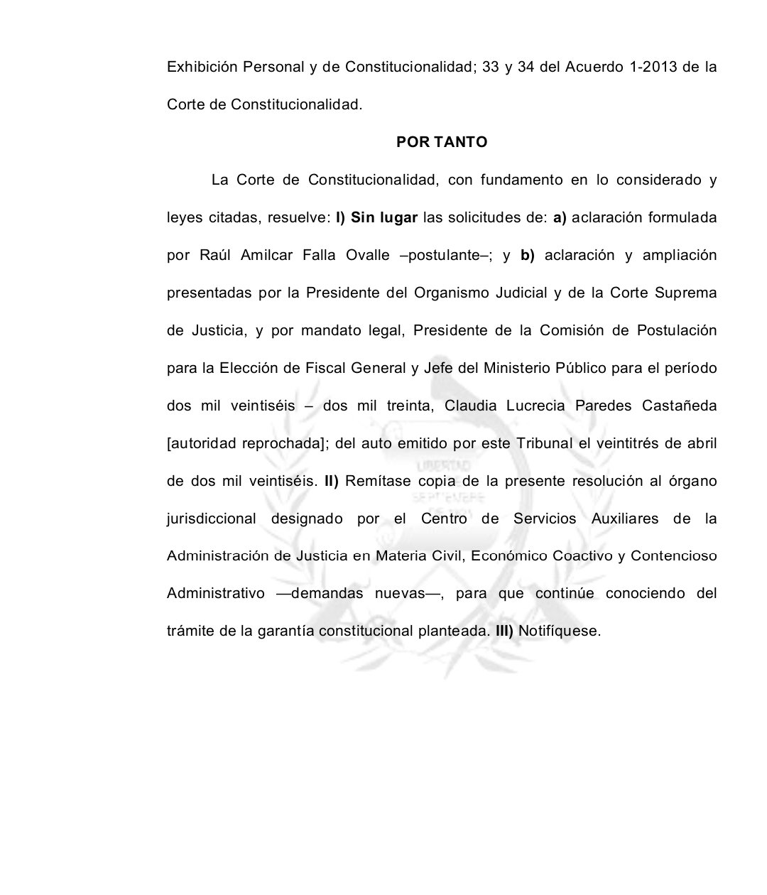 Con base en estos elementos, la CC resolvió rechazar tanto la solicitud de aclaración presentada por Falla como la planteada por la presidenta del Organismo Judicial y de la Corte Suprema de Justicia, Claudia Paredes, en su calidad de presidenta de la Comisión de Postulación.