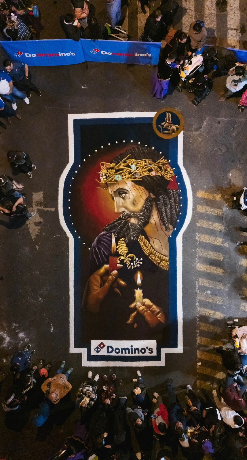 Este año, Domino’s se sumó a la tradición con una propuesta que combinó creatividad y convivencia. De la mano del colectivo Chucho Callejero, se creó una alfombra única que destacó por sus detalles y simbolismo, reflejando el espíritu de unidad que caracteriza la Semana Santa.
