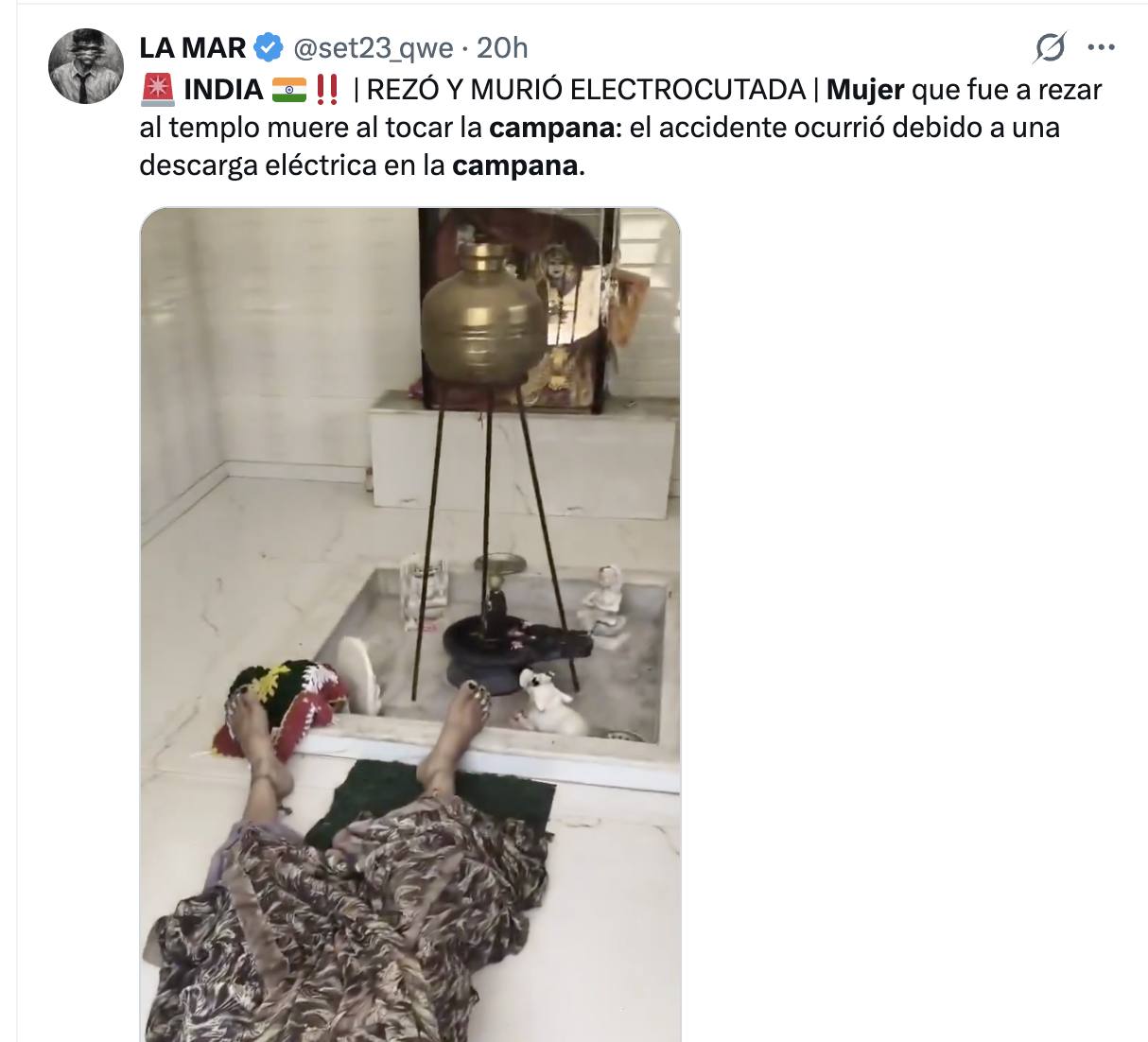 Una mujer perdió la vida luego de recibir presuntamente una descarga eléctrica mientras se encontraba en un templo en India, a donde había acudido con fines religiosos. El hecho, que ha trascendido principalmente a través de reportes en redes sociales, habría ocurrido cuando la víctima tuvo contacto con una campana, elemento tradicional en este tipo de recintos.